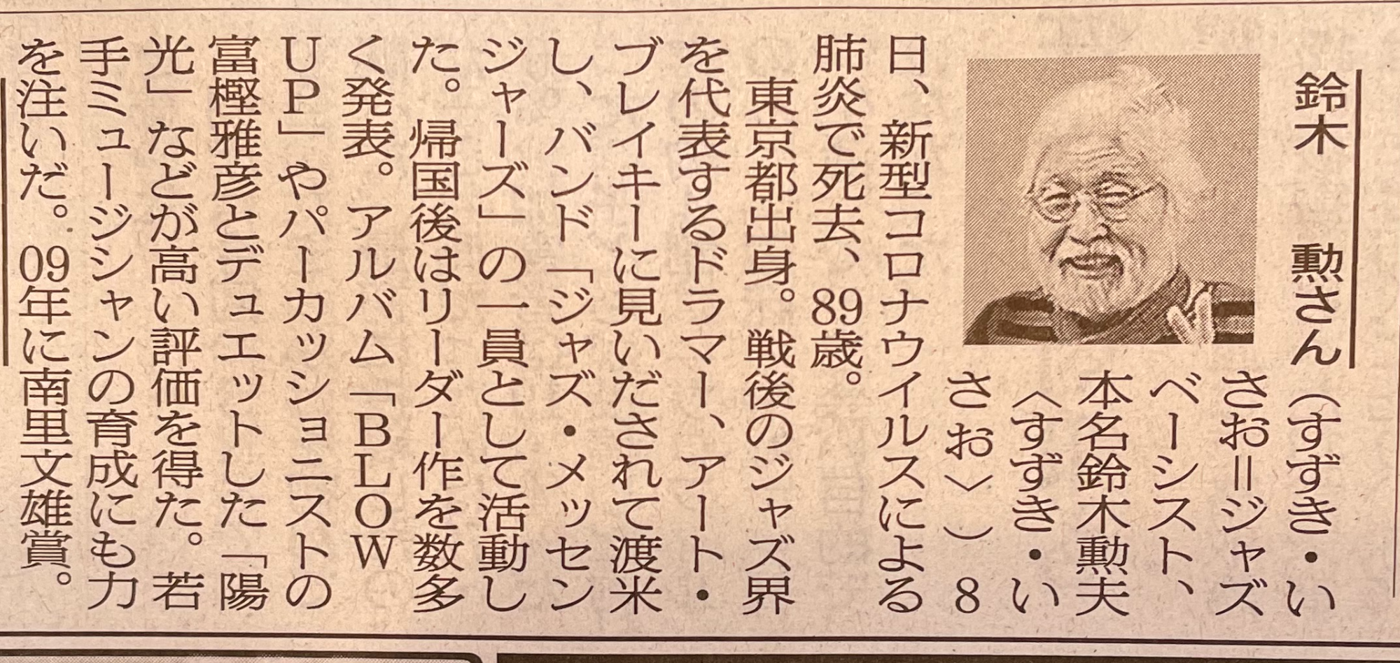 こんばんは。3/8に日本Jazz界の巨匠、ベーシストの鈴木勲さんが、89歳でコロナのためにこの世を去ったことを新聞の訃報欄で昨日知りました。彼が大阪のなんばのJazz Live SpotのLoft 6のオーナーだったことは大分経ってから知ることになるのですが、勤務医時代によく行ったこの店に時々演奏に来られているゲストミュージシャンだと最初は思っていました。子どもたちがまだ幼い時に我が家に来られたこともありました。健康相談の電話もよくかかってきました。東京や横浜に学会出張の際には現地のJazzの店に伺ったり、大阪に演奏に来られた際にはまたそちらでお目にかかったりしたものです。一度は市立堺病院で胃カメラもさせてもらいました。日本の若手のJazz musician を沢山育てて旅立って行かれました。three blind miceというレーベルのレコードは愛聴盤です。彼がベーシストになろうとしたきっかけは、1950年代に来日していたルイ・アームストロング・オールスターズのベーシストのミルト・ヒントンの演奏に衝撃を受けたことからとのこと。1970年に来日したアート・ブレイキーにスカウトされ渡米。帰国後はまた大活躍。B-Roxyでは、毎晩のように、海外からも多数の有名jazz musicianが訪れて、来日公演のアフターで素晴らしい演奏を繰り広げていました。